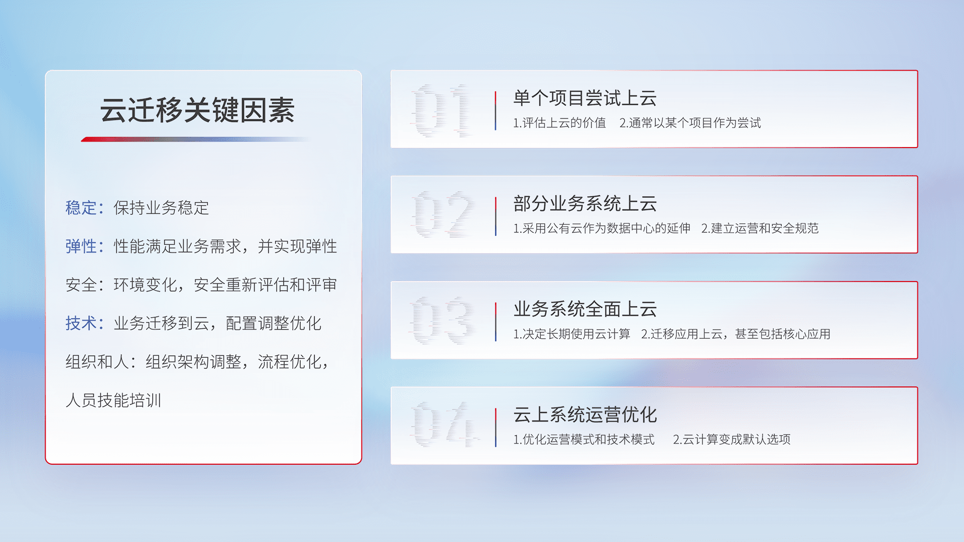 结合实际业务,,,从规划设计、、云平台选型、、云原生改造、、、数据迁移、、集成交付,,迁移全过程为客户识别最佳上云路径,,做好风险识别管理,,,设计网络架构、、身份权限、、、安全审计合规、、、操作审计、、、日志审计、、、、监控告警策略、、、多站点容灾设计等,,,对云上基础设施进行整体规划,,,,提升IT治理水平,,以满足弹性、、、高可用、、高性能的需求。。