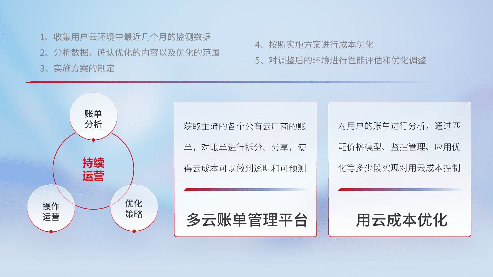 通过多云纳管,,,,以统一的资源数据模型把客户的云资源进行抽象和封装,,进而实现对多云资源的统一操作,,保障云资源管理的可靠性、、、、稳定性与可用性。。。量身定制化运维内容,,,配置、、开发运维、、、、补丁管理、、备份、、、、监控、、、认证和访问管理、、审计和日常巡检等,,保障在用云过程中的可靠度,,,稳定度以及高可用率。。。